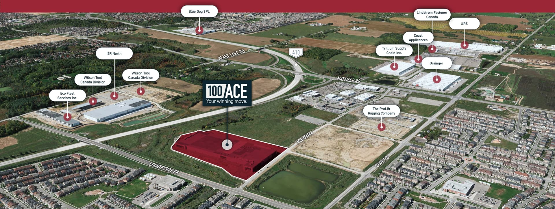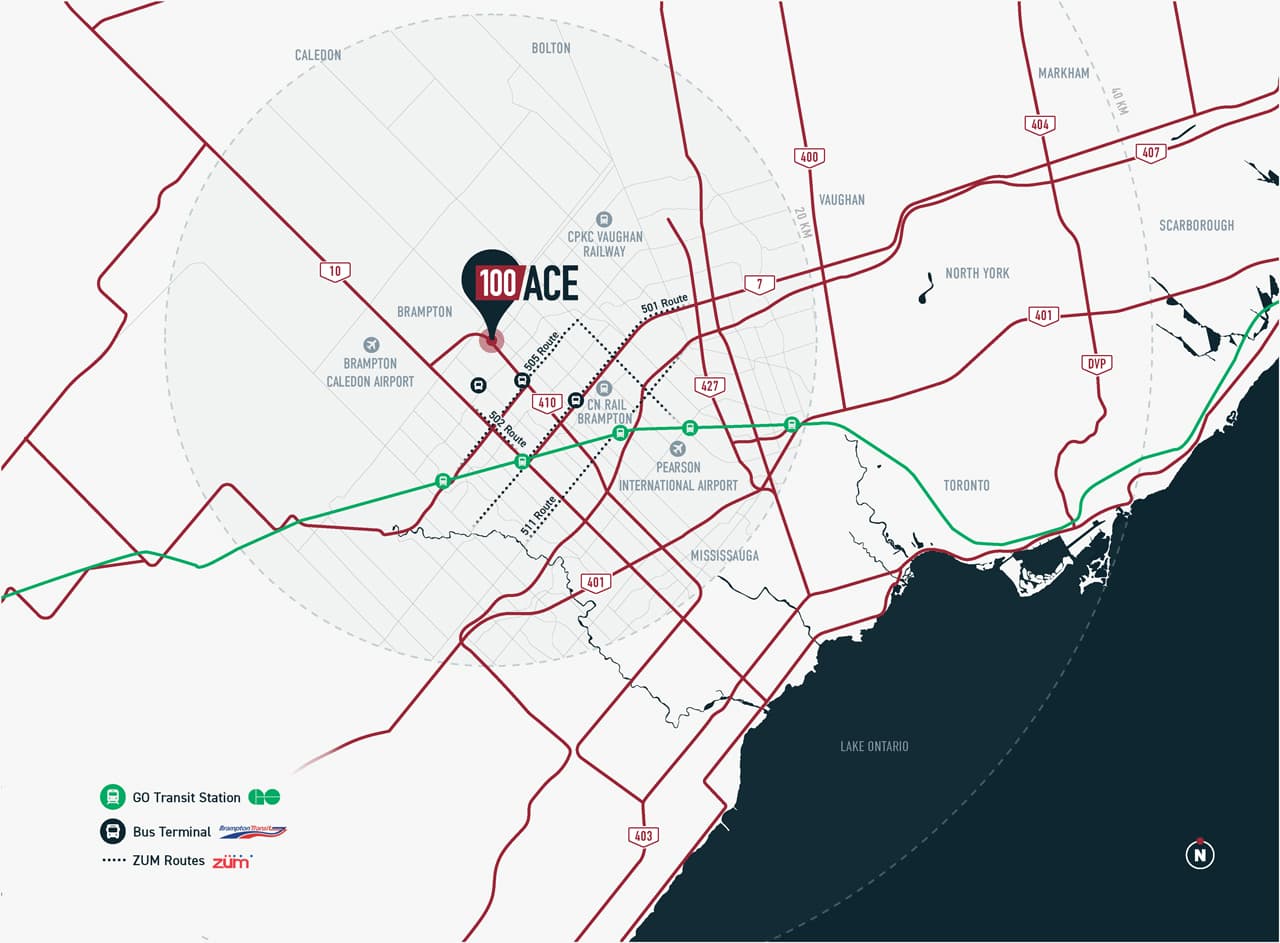 Strategically located in the heart of Brampton, 100 Ace is a 4-minute drive to Highway 410 and less than 15 minutes to the rest of the Highway 400 series connecting you to more opportunities.